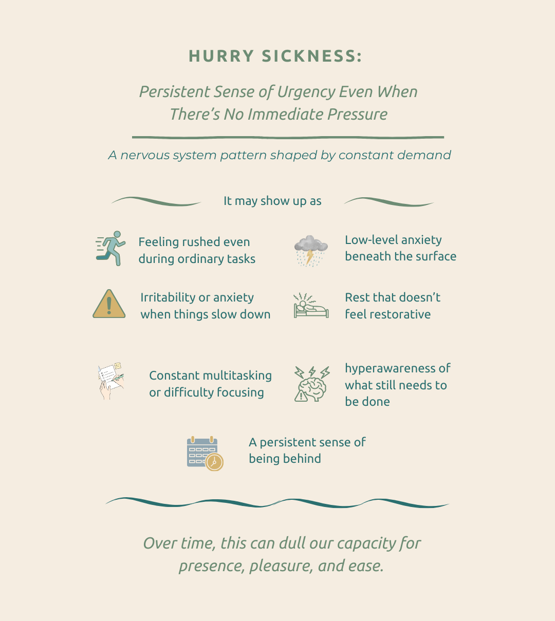 Hurry sickness shows up quietly, but often time insistently. It looks like: